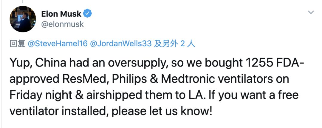 馬斯克在推特表示,他從中國采購了這批經過FDA認證的呼吸機,因為中國的呼吸機目前供應充足。他還在推特上感謝了特斯拉中國團隊和中國海關對采買、運送呼吸機提供的支持和幫助。