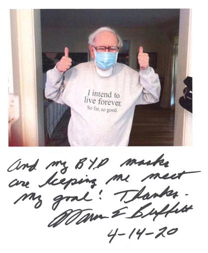 巴菲特稱,“我的目標是長命百歲,目前為止進展還不錯。而現在,比亞迪口罩更是助我一臂之力!謝謝!”---沃倫·巴菲特,2020年4月14日