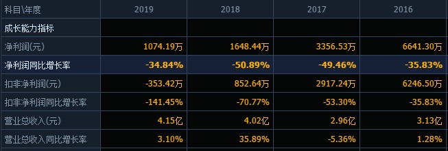 從廣生堂2019年的年報(bào)數(shù)據(jù)看,公司的營(yíng)業(yè)收入為4.15億元,同比增長(zhǎng)3%;歸母凈利潤(rùn)為1074.19萬(wàn)元,同比下滑34.84%;扣非歸母凈利潤(rùn)為-353.42萬(wàn)元,同比下降141.45%。