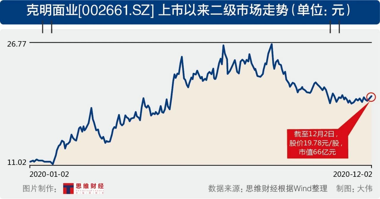 但即便如此,克明面業在二級市場上仍然大幅回調。8月26日至12月3日,該股已累計下滑25%,市值蒸發24億元。