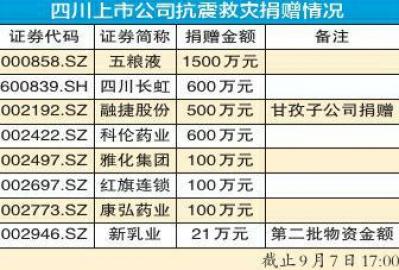 與此同時,多家四川上市公司第一時間作出響應,迅速支援抗震救災。據不完全統計,截至目前,科倫藥業、紅旗連鎖、五糧液、康弘藥業、四川成渝、四川路橋、雅化集團、新乳業等8家四川上市公司積極參與抗震救災工作,累計向災區捐贈金額超3000萬元。