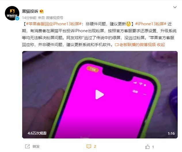 據黑貓投訴消息稱,大量網友投訴iPhone13出現粉屏問題,在使用手機時屏幕會出現大量粉色區域,甚至屏幕完全充斥著粉色,同時還伴隨著不同程度的卡頓、閃退、自動重啟等問題。