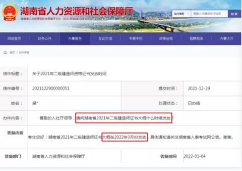 1月4日,湖南省人力資源和社會保障廳回復(fù)考生咨詢二建證書何時發(fā)放的問題:湖南省2021年二級建造師證書大概在2022年3月份發(fā)放,具體通知請關(guān)注湖南人事考試網(wǎng)公告。