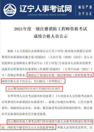 2022年2月9日,遼寧省人事考試網(wǎng)公布《2021年度注冊消防工程師資格考試成績合格人員公示》,將遼寧省2021年度一級(jí)注冊消防工程師資格考試成績合格人員予以公示,共1466人,公示期為2022年2月10日至2022年2月19日,公示期間各級(jí)人事考試部門將對成績合格人員報(bào)考資格進(jìn)行核查核驗(yàn)。