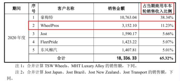 一輪問詢回復說明了宏鑫科技細分業務對應主要客戶的基本情況,包括但不限于成立時間、注冊資本、銷售模式、銷售金額及占比等。一輪問詢回復第275頁顯示,2020年度宏鑫科技向客戶WheelPros, LLC.(下稱:WheelPros)銷售商用車車輪的金額為3,152.10萬元。