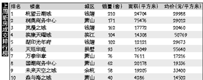 上周(1月17日—1月23日),市區成交套數前十項目共成交1078套、21.1萬平方米。銷量前十名中,錢塘3席,蕭山4席,拱墅1席,濱江1席,余杭1席。