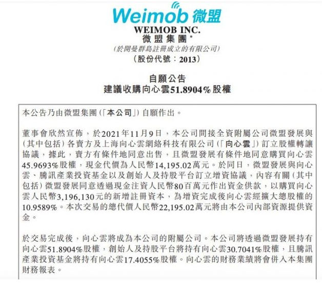 11月10日消息,微盟日前對外發(fā)布公告稱,通過全資附屬公司微盟發(fā)展以人民幣2.2億元收購上海向心云網(wǎng)絡科技有限公司(以下簡稱:向心云)51.89%股權,交易完成后,向心云將成為微盟集團附屬公司并納入上市公司體系。本公司將獲得導購數(shù)字化能力的快速深化,夯實智慧零售領域的競爭優(yōu)勢,完善在智慧零售領域的數(shù)字化版圖。