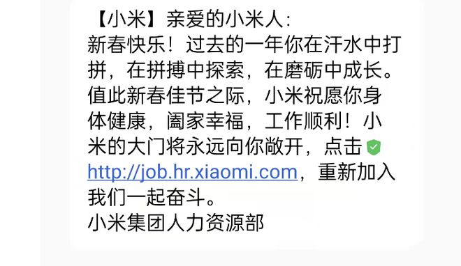 不僅如此,此前小米的離職老員工近日還收到短信消息稱小米的大門永遠(yuǎn)敞開,歡迎重新加入小米一起奮斗。