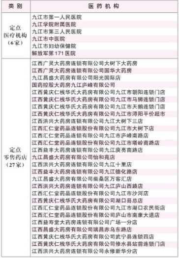通過醫藥機構申請、組織專家評審、核驗資質、擇優選擇,九江首批開放“雙通道”定點醫療機構和定點零售藥店共33家,定點醫療機構有九江市第一人民醫院、九江學院附屬醫院、九江市第三人民醫院、九江市中醫院、九江市婦幼保健院、解放軍第171醫院;定點零售藥店有江西廣靈大藥房連鎖有限公司大樹下大藥房、九江昌盛大藥房有限公司陽光國際店、國藥控股大藥房九江廬峰有限公司等27家。