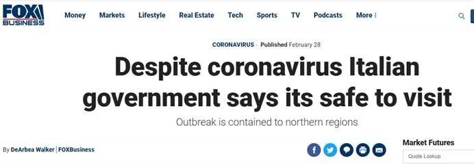美國??怂剐侣劸W(wǎng)就在一篇報道中稱,雖然意大利的疫情非常嚴重,但意大利政府仍說意大利很安全,游客們可以來玩。