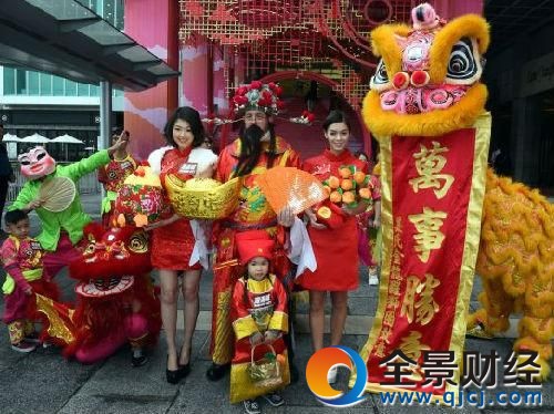香港海港城在海運(yùn)大廈露天廣場(chǎng)推出大型農(nóng)曆新年布置,“財(cái)神”(中)為市民帶來新春祝福。新華社發(fā)