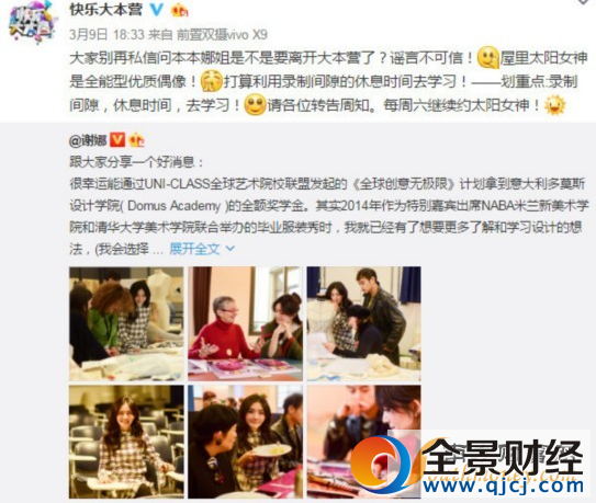 3月2日下午,謝娜發文稱拿到了意大利多莫斯設計學院(Domus Academy)的全額獎學金,要去出國深造,不少網友猜測她是不是要離開《快本》了?不過她特別強調:“我會選擇每次工作與工作間隙去學習,都已經去學習過一次啦。