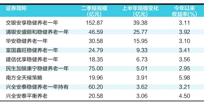 從規模增長情況看,交銀安享穩健養老一年上半年規模增長39億元,規模增長最多;浦銀安盛頤和穩健養老一年、華安穩健養老一年同期規模增長分別為26億元、16億元。