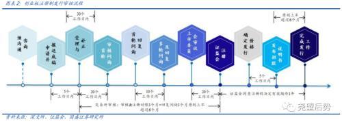 其次,發行流程上,也大致流程與科創板相同,區別在于創業板規定交易所審核+證監會注冊的時間總計不超過三個月,較科創板以及此前征求意見稿的交易所審核3個月+證監會注冊20天的規定,期限再次縮短。