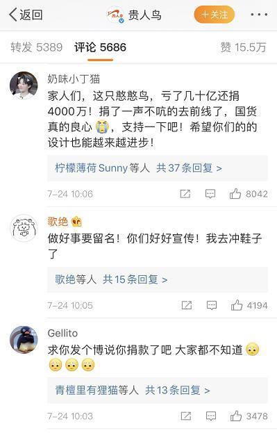 于是,繼 7 月 24 日 # 貴人鳥捐款 # 沖上熱搜后,網友們開始瘋狂涌入貴人鳥直播間,觀看量從幾千人暴漲至一百多萬人,多款商品被搶斷貨。甚至有網友還在官博底下喊話:" 趕快補貨!我想野性消費!"