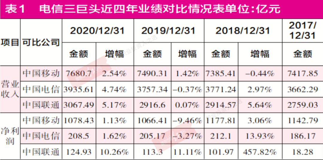 從表1來看,雖然在營收增長上,三大運營商2017年以來均實現增長,但收入規模增速卻都不快。凈利潤方面,三者不再同步,之間存在明顯分化。比如中國移動,2020年的凈利潤實現額還不如2017年,相當于發展4年后出現退步;中國電信2020年的凈利潤雖比2017年高,但實際上也比不上2018年,基本負增長;中國聯通近幾年是一直增長的,但因其前期實力太弱,經營業績基數很低,即便是業績出現了連續增長,實現金額仍在三家公司中“吊車尾”。
