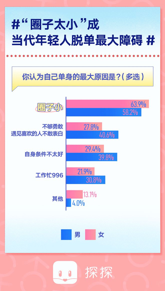 本次調研中,年輕用戶普遍單身時間較短,60.2%的女性單身時間1年以內,男性這一選項占比為43.2%。而“圈子小”“不夠勇敢、遇見喜歡的人不敢表白”“自身條件不太好”則成為用戶票選出的脫單障礙TOP3。