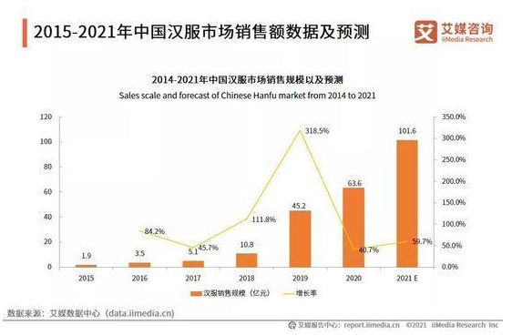 據艾媒發布的數據顯示,2021年漢服市場規模將破百億。重回漢唐掌柜孫異估計,這一規模有望在5-8年內增長十倍,達到千億。