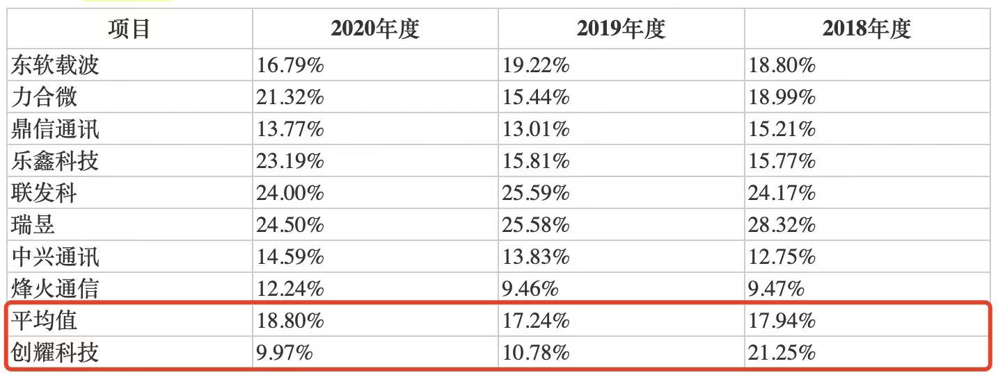 2018年-2020年(以下或稱“報告期”)創耀科技的研發費用分別為2314.79萬元、1782.14萬元和2089.41萬元,占營業收入的比重分別為21.25%、10.78%和9.97%,研發費用以及研發費用率都呈下滑的趨勢。而同期內,行業內公司的研發費用率均值分別為17.94%、17.24%和18.80%,創耀科技的研發費用率也遠遠低于同行業公司。