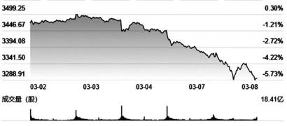 早盤短暫震蕩后,滬深兩市再度快速回落,跌幅較前一交易日小幅收窄。3月8日,滬指在前一交易日跌穿3400點整數關口后繼續回落,盤中波動明顯加大,最終收在3300點整數關口下方,短短2個交易日兩個整數關口便接連失守。深成指則是小幅高開短暫反彈后震蕩回落,全日跌幅仍高于滬指。截至收盤,滬指報收3293.53點,大跌2.35%;深成指報收12244.5點,大跌2.62%;創業板指報收2582.99點,下跌1.8%。兩市成交量開始放大。