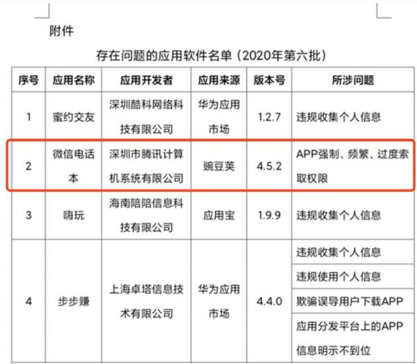2020年12月,工信部發布《關于侵害用戶權益行為的APP通報(2020年第六批)》,微信電話本等60款APP因違規被點名,要求限期整改,其中微信電話本所涉問題為“APP強制、頻繁、過度索取權限”。