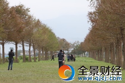 漸漸轉紅的落羽松成排,構成浪漫景色。