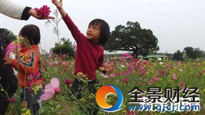 游客在「臺中金城武樹」旁的波斯菊田採花。