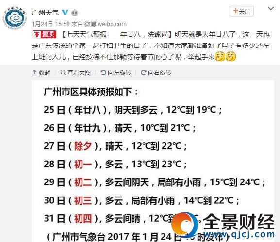 【七天天氣預報——年廿八,洗邋遢】明天就是大年廿八了,這一天也是廣東傳統的全家一起打掃衛生的日子,不知道大家都準備好了嗎?有多少還在上班的人兒,已經按捺不住那顆等待春節的心了呢,舉起手來