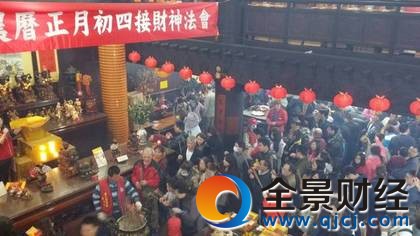 金山財(cái)神廟接財(cái)神法會(huì),香客擠爆,人聲鼎沸。
