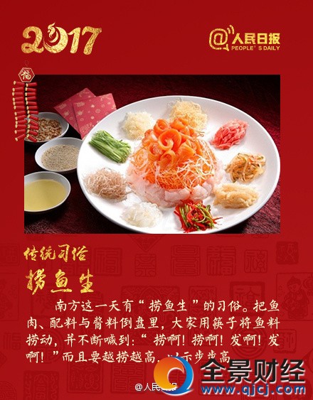 南方一些地區,人們有在人日節“撈魚生”的習俗,撈魚生時,往往多人圍滿一座,把魚肉、配料與醬料倒在大盤里,大家站起身,揮動筷子,將魚料撈動,口中還要不斷喊到:“撈啊!撈啊!發啊!發啊!”,而且要越撈越高,以示步步高升。