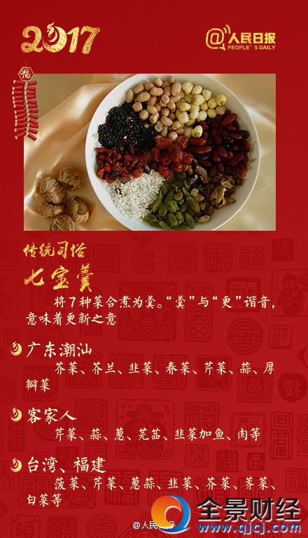大年初七是“人日”,人人過生日,要以七種蔬菜,煮成七菜羹,也就是將七種蔬菜,煮成雜菜湯,在農業社會,大家都祈望吃了七菜羹,來年大豐收。各地物產不同,所用果菜不同,取意也有差別。廣東潮汕用芥菜、芥蘭、韭菜、春菜、芹菜、蒜、厚瓣菜;客家人用芹菜、蒜、蔥、芫茜、韭菜加魚、肉等;臺灣、福建用菠菜、芹菜、蔥蒜、韭菜、芥菜、薺菜、白菜等。其中芹菜和蔥兆聰明,蒜兆精于算計,芥菜令人長壽,如此種種。