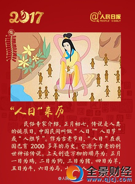 民族認為,正月初七是“人類的生日”。亦稱“人勝節”、“人慶節”、“人口日”、“人七日”等。傳說女蝸初創世,造世上生靈萬物,第一日造雞,二日狗,三日豬,四日羊,五日牛,六日馬,七日人,于第七天造出了人,所以這一天是人類的生日。