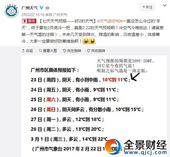 【七天天氣預(yù)報——好2的天氣】#天氣話你知#一直沒怎么冷過的“冬天”,終于要在2月底冷一把,真是2.22的天氣預(yù)報啊!冷空氣今晚抵達(dá)(請留意第一天氣溫的注釋),未來幾天受到降水、降溫的影響,日夜溫差小,體感寒冷,大家一定要做好防寒措施啊!