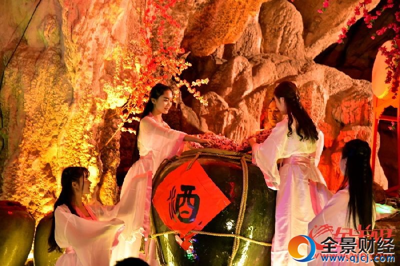今年桃花節(jié)正值農(nóng)歷二月二龍?zhí)ь^期間,連州地下河首度復原了起源于明代正德年間,中斷了上百年的桃花酒釀制習俗,并在地下河舉行了傳統(tǒng)的封壇儀式。現(xiàn)場,連州地下河的長壽洞內(nèi),高1.2米直徑1米的巨型酒壇里,已經(jīng)洞藏了五年的糯米酒,清香四溢。祭祀官按照傳統(tǒng)儀式,祭拜天地、壽星與酒神,擂響封壇大鼓。瑤家妹子端起裝滿桃花花瓣的簸箕,將散發(fā)著花香味的新鮮桃花倒入酒中。旁邊的瑤家漢子拿起牛皮紙、黃泥、石膏、蜂蠟封酒。