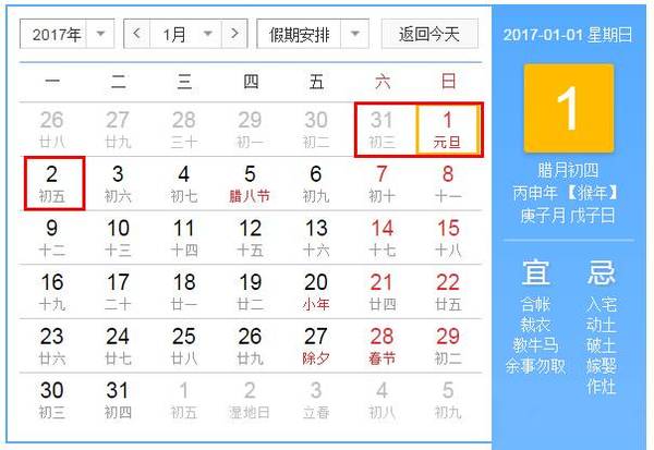 今天已是2016年12月1日,離2017年只有近1個月的時間,近日,就有網友將2017年放假時間表發到網上,引起了不少網友的關注,距離最近的元旦成了第一個假日,元旦——2017年12月31日至1月2日調休,放假3天。