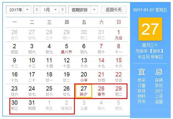 2017年1月27日至2017年2月2日調休,放假7天。1月27日(星期五,農歷除夕)、1月28日(星期六,農歷正月初一)、1月29日(星期日,農歷正月初二)為法定節假日。