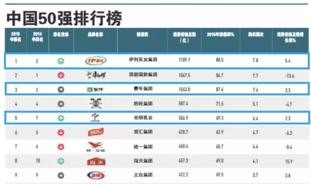 當然,四大乳品企業(yè)花巨額廣告費用還是很有成效的。根據凱度消費指數發(fā)布的《2016年全球品牌足跡報告》,中國品牌50強排行榜中,伊利股份名列第一,2015年消費者觸及數是1,109.1億人次,意味著13億中國人平均每人每年要看到伊利的廣告85次,蒙牛乳業(yè)和光明乳業(yè)分列第三和第五。