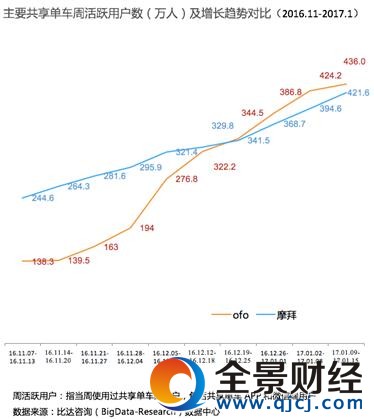共享單車之“楚漢之爭” ofo周活增幅達215%超摩拜