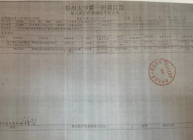患者王海森從鄭大一附院調取的“植入類醫療器材登記表”。新京報記者 程亞龍 攝