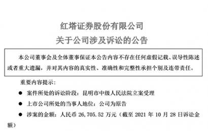 近日,紅塔證券已收到云南省昆明市中級人民法院的通知書,法院對其起訴予以立案受理。目前本案尚未收到開庭通知。