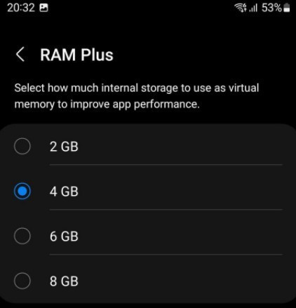 三星的新技術命名為RAM Plus,三星在One UI 4.1中對RAM Plus技術進行了不小的調整,之前只能固定在4G的增量,而目前可以選擇2、4、6、8Gb進行調整。