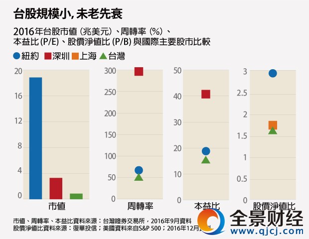 低周轉(zhuǎn)率:「周轉(zhuǎn)率」指股票交易量除以股票發(fā)行總數(shù),代表一個(gè)股市的交易熱絡(luò)程度。在市場成熟的美國周轉(zhuǎn)率是72%,臺(tái)灣則是51.9%,對(duì)照過去周轉(zhuǎn)率曾達(dá)300%,臺(tái)股資金流動(dòng)性差,不如一般新興市場活絡(luò)。