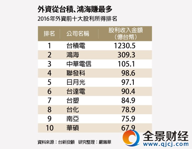 除了臺(tái)積電之外,今年外資也從鴻海拿走309億元股息、從中華電信拿走105億元股息,從前十大外資股利所得排名來看,外資一共領(lǐng)走2200億元,是臺(tái)股資本市場最大贏家。