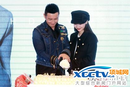 Angelababy(左)昨驚喜現(xiàn)身,送黃曉明生日蛋糕。合成照片