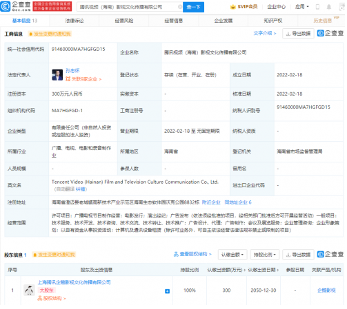 企查查APP顯示,2月18日,騰訊視頻(海南)影視文化傳播有限公司成立,法定代表人為孫忠懷,注冊資本300萬元人民幣,經營范圍包含:廣播電視節目制作經營;電影發行;演出經紀;廣告發布等。企查查股權穿透顯示,該公司由上海騰訊企鵝影視文化傳播有限公司100%控股。