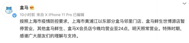 盒馬官方還表示,按照上海市疫情防控要求,上海市黃浦江以東部分盒馬鄰里門店、盒馬鮮生世博源店暫停營業,其他盒馬鮮生、盒馬X會員店3月27日均營業至24點,3月28日照常營業。