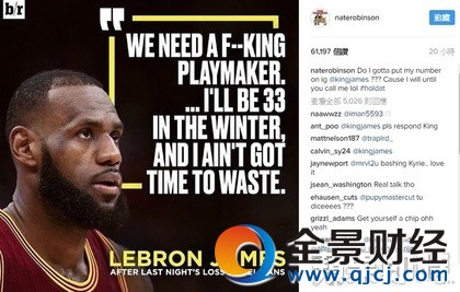 騎士在過(guò)去7場(chǎng)比賽輸了5場(chǎng),戰(zhàn)績(jī)不佳讓一哥詹姆士(LeBron James)大動(dòng)肝火,不但爆粗口強(qiáng)調(diào)球隊(duì)需要一名組織控衛(wèi),也透露自己今年冬天就滿33歲,已沒(méi)有時(shí)間可以浪費(fèi),已1年沒(méi)球可打的174公分控衛(wèi)羅賓森(Nate Robinson)在Instagram率先表態(tài):「我等你來(lái)電!」羅賓森生涯曾拿過(guò)3次灌籃大賽冠軍,身高嬌小的他彈性爆發(fā)力一流,上季他在鵜鶘僅出賽2場(chǎng),打不到23分鐘就被球隊(duì)釋出,之后一直乏人問(wèn)津,今年將滿33歲的他,一直希望能重返NBA,看到騎士近來(lái)正鬧控衛(wèi)荒,他乾脆在社群網(wǎng)站公開(kāi)推薦自己。羅賓森在個(gè)人IG先Po出ESPN報(bào)導(dǎo)連結(jié),報(bào)導(dǎo)指出騎士在最近7場(chǎng)比賽中輸了5場(chǎng),詹姆士很不OK!羅賓森在文末俏皮地留言說(shuō):「@ESPN,Nate Robinson有空喔!勾送馑在IG上Po出媒體製作的照片,并留言寫著:「@KingJames