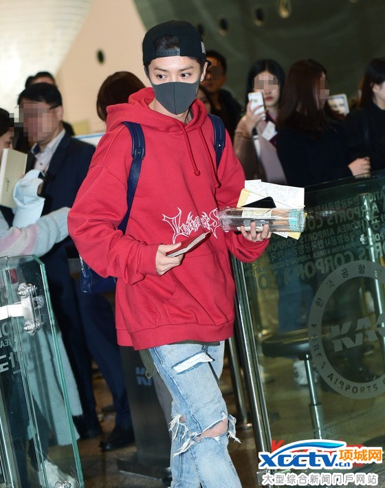 鹿晗紅衛衣加破洞褲現身仁川機場 粉絲大呼趕緊回家穿秋褲