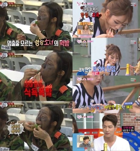 惠利出演《真正的男子漢》女軍特輯時黑著一張臉大口吃烤肉,這一幕已經(jīng)很震撼了,之后到Y(jié)ura和洪宗玄的《我們結(jié)婚了4》里客串演出,五口就吃光一碗炸醬面,更是讓人驚到掉下巴。(請注意右下角洪宗玄震驚的神情)