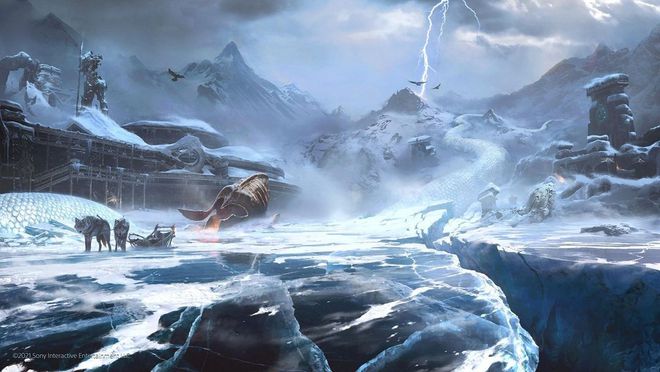 在世界蛇旁邊還有一輛狼雪橇,奎爺將在《戰(zhàn)神:諸神黃昏》冰天雪地中穿行,除了能乘船,還能利用其他交通工具。在概念圖中,一道閃電擊中山頂,暗示了雷神托爾的位置。